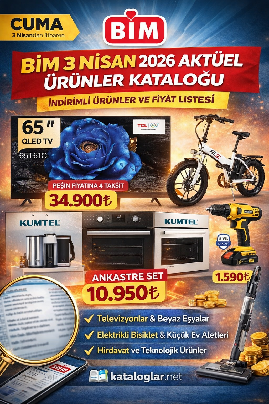 BİM 3 Nisan 2026 aktüel ürünler kataloğu, bu hafta da birbirinden cazip fırsatlarla kullanıcıların karşısına çıkıyor. Özellikle televizyon, elektrikli bisiklet ve ankastre set gibi yüksek fiyatlı ürünlerde yapılan indirimler dikkat çekiyor.